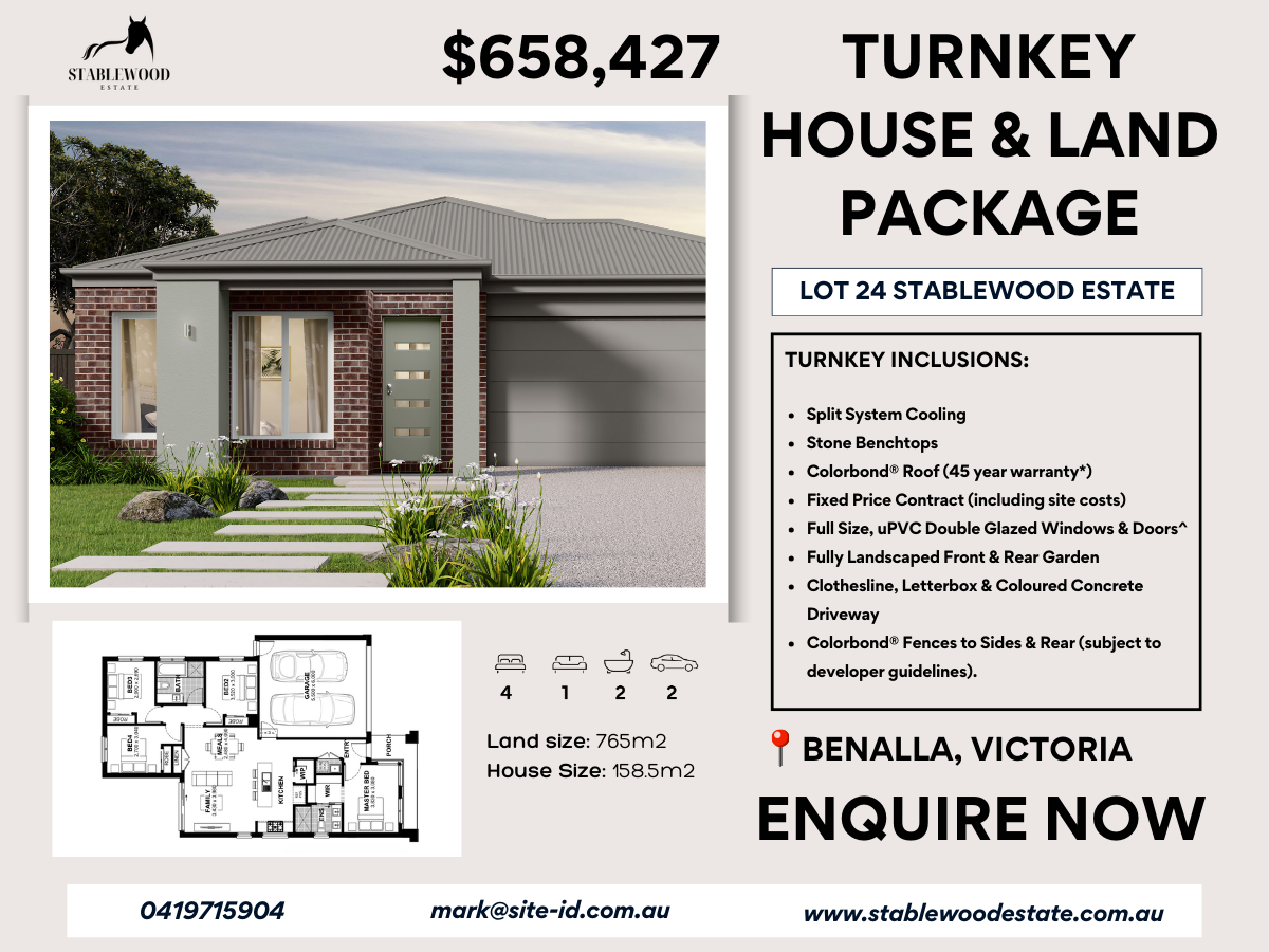 This 4-bedroom, 2-bathroom turnkey home is set on a spacious 765m² north-facing block in the heart of Stablewood Estate, one of Benalla’s fastest-growing communities. With 158.5m² of internal living space, high-quality inclusions, and full turnkey delivery, this is your opportunity to secure a stress-free new build — ideal for first home buyers, downsizers, or investors.