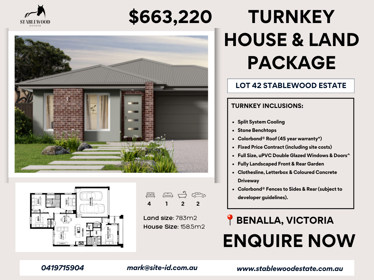 A premium corner block paired with a quality turnkey build makes this 4-bedroom, 2-bathroom home a standout opportunity in Benalla’s thriving north. With full landscaping, appliances, and quality finishes included, this is true turnkey living – just move in and enjoy.