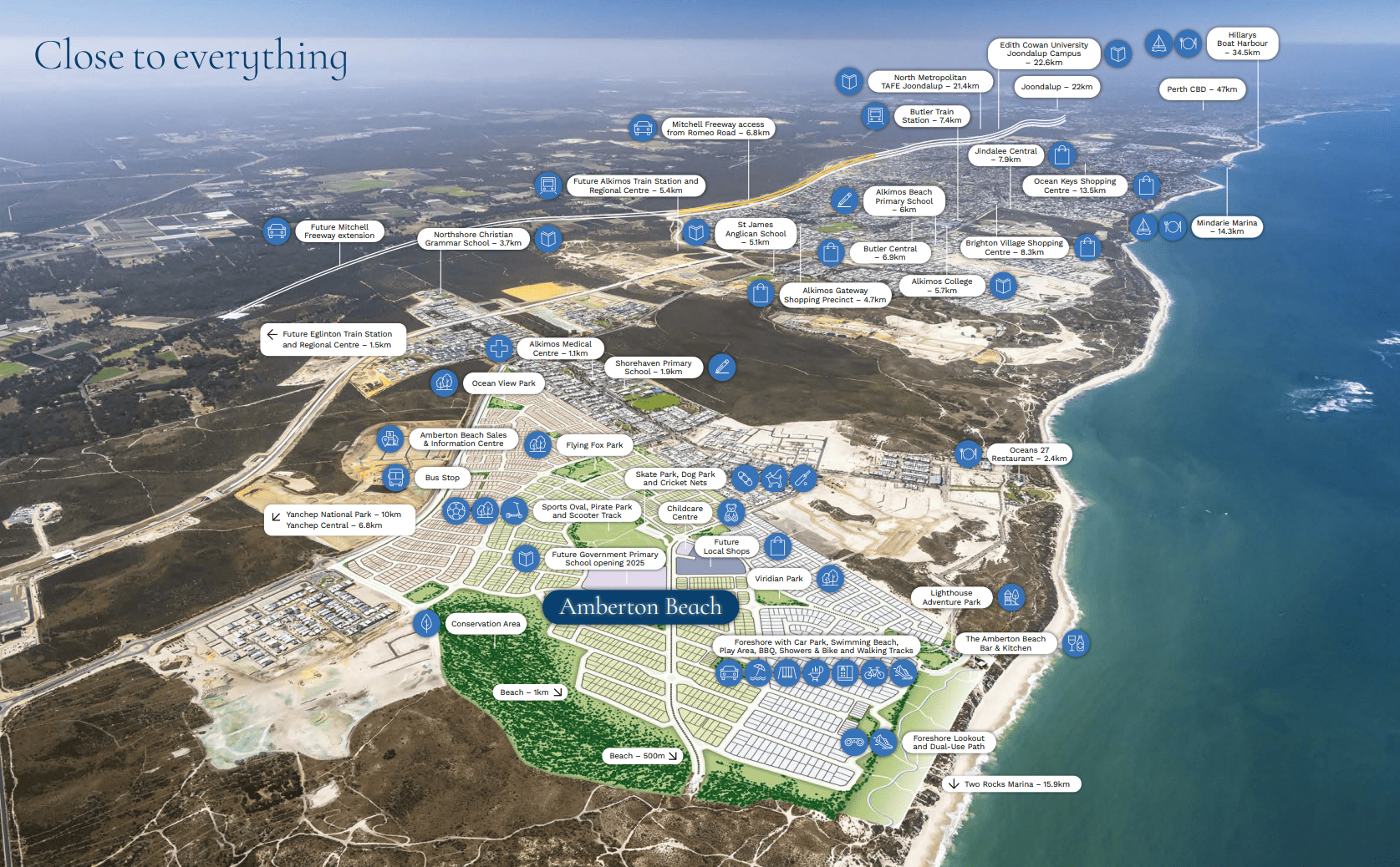 Amberton Beach is true coastal living with the convenience of city connection. Located at the west of Marmion Avenue with easy access to the Mitchell Freeway, Eglinton train station and bus stops make travel quick and simple.