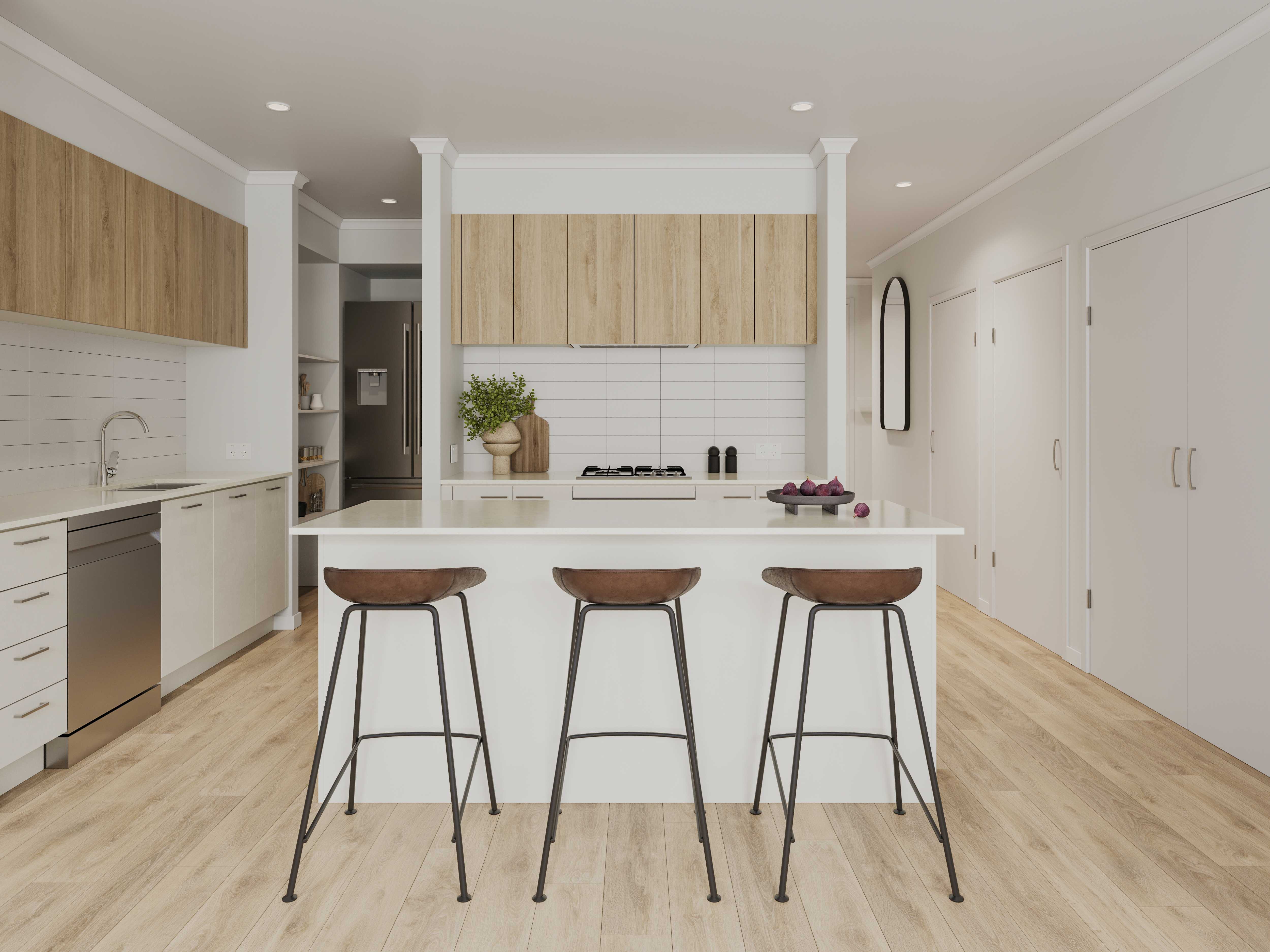 • 20mm Caesarstone (silica-free) benchtops to kitchen and bathrooms