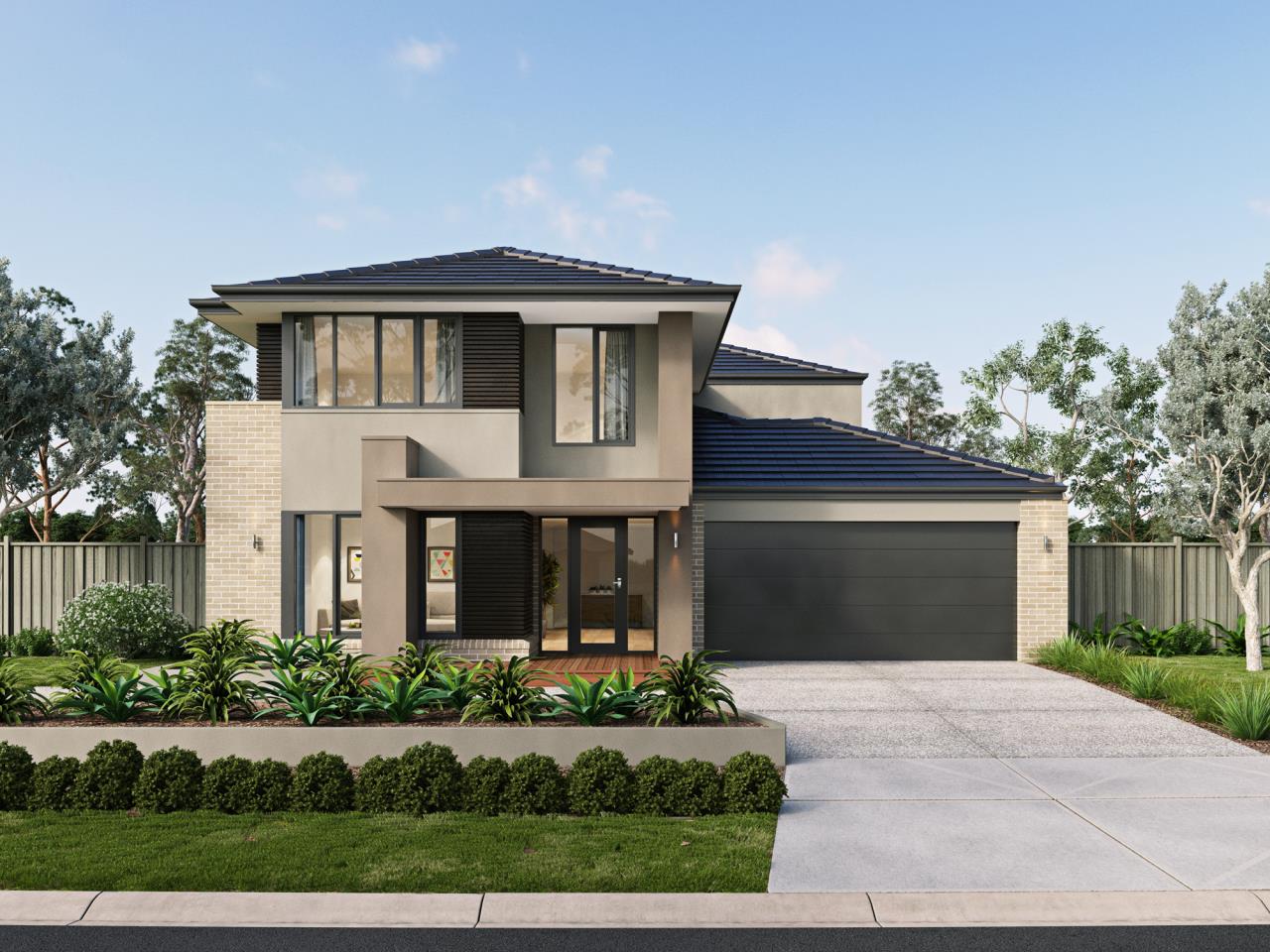 *Price excludes upgrade items above standard specification such as feature render and bricks, front entrance timber decking, front entry door, brick infills above garage, external lighting, fencing, concrete paths and driveway. Facade Image may also contain items not supplied by Metricon, namely landscaping and planter boxes. Aluminium double glazed windows are subject to specific home design, refer to plans.